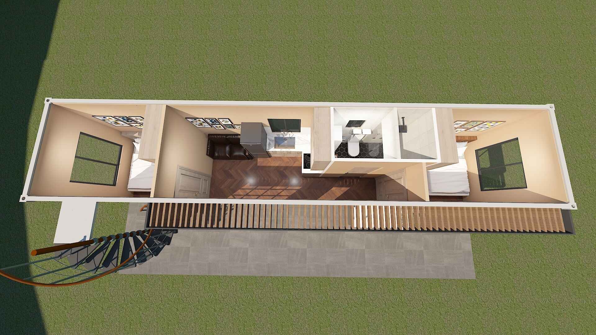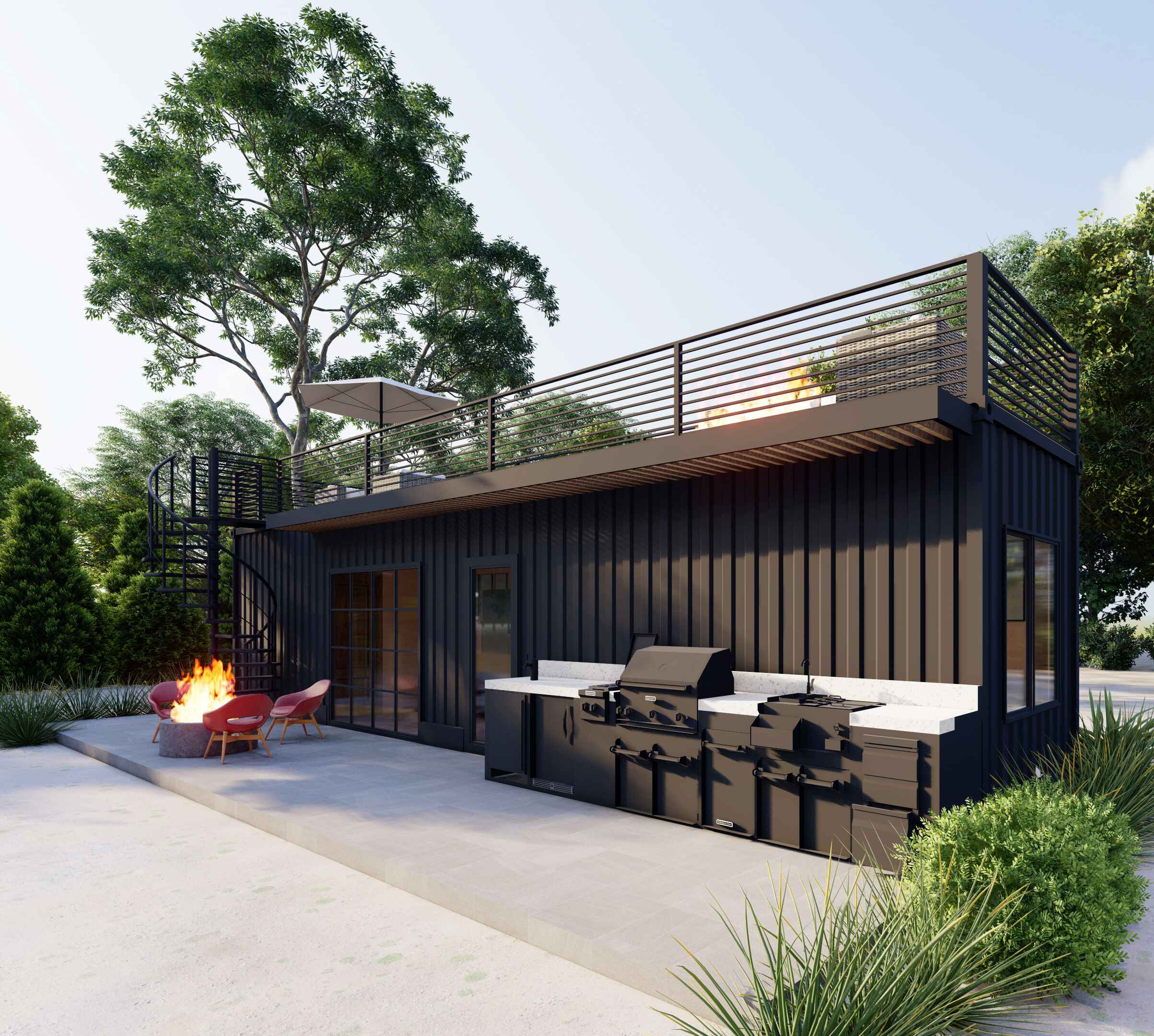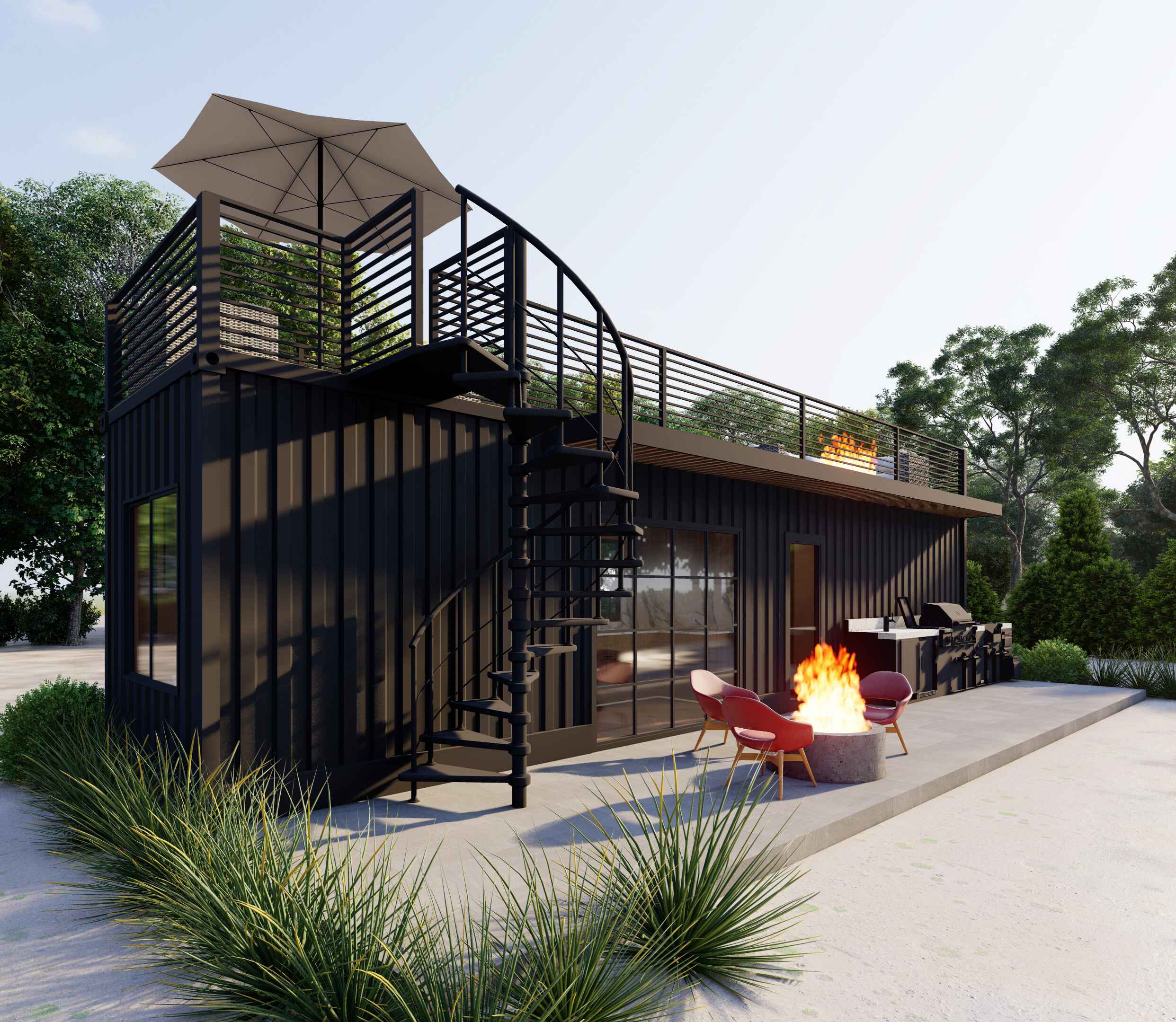 This meticulously crafted two-bedroom container home boasts a spacious 320 square feet of modern living. The intelligently designed open-plan layout features a combined kitchen and living area, fostering a seamless blend of culinary space and comfort. Two cozy bedrooms, each equipped with ample closet space, promise privacy and rest, while the centrally located bathroom ensures convenience. Expansive windows infuse the home with natural light, enhancing the sense of openness. Step outside to a charming patio, perfect for tranquil evenings or your morning coffee. Above, a full-length roof deck becomes your private sky lounge, ideal for entertaining, stargazing, or simply basking in the sun. With additional luxuries like a built-in fireplace, an outdoor B.B.Q, and a stylish fire pit, this container home redefines efficient luxury living.
