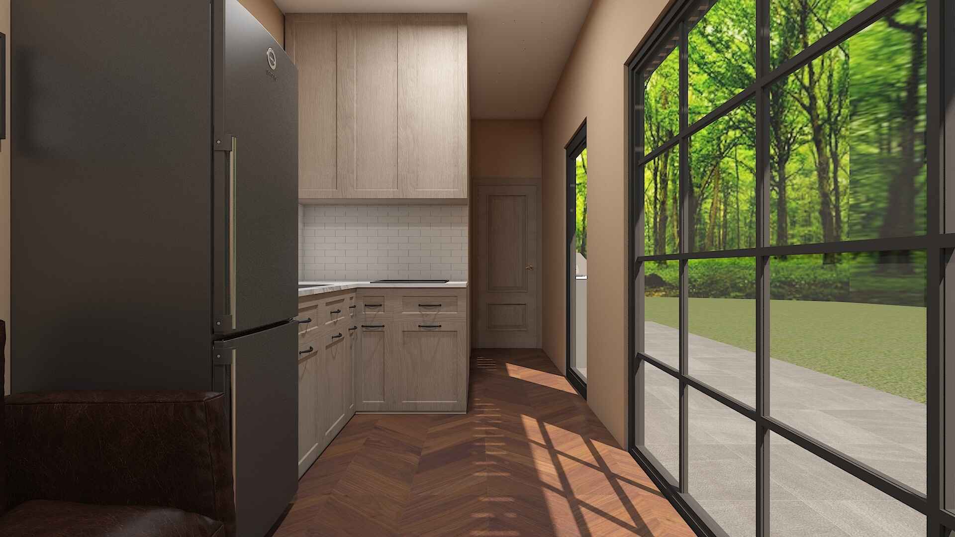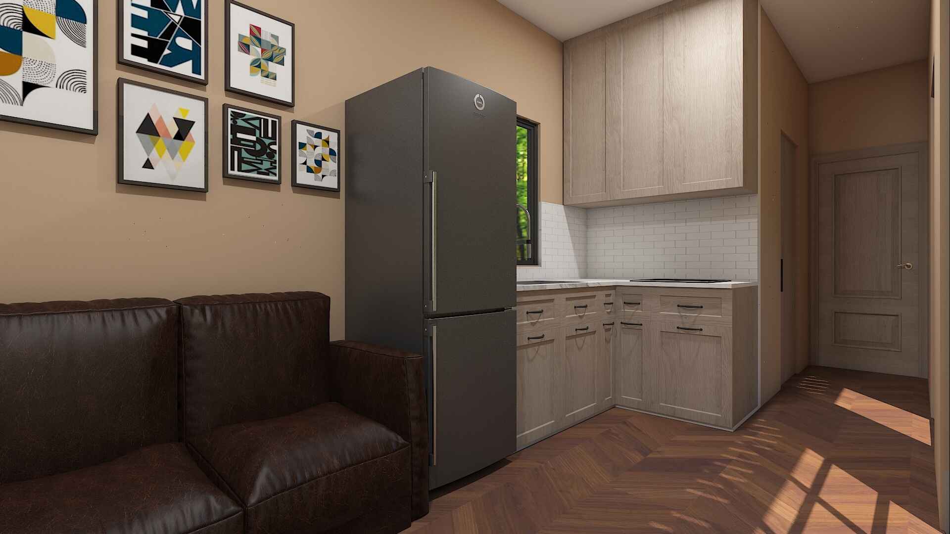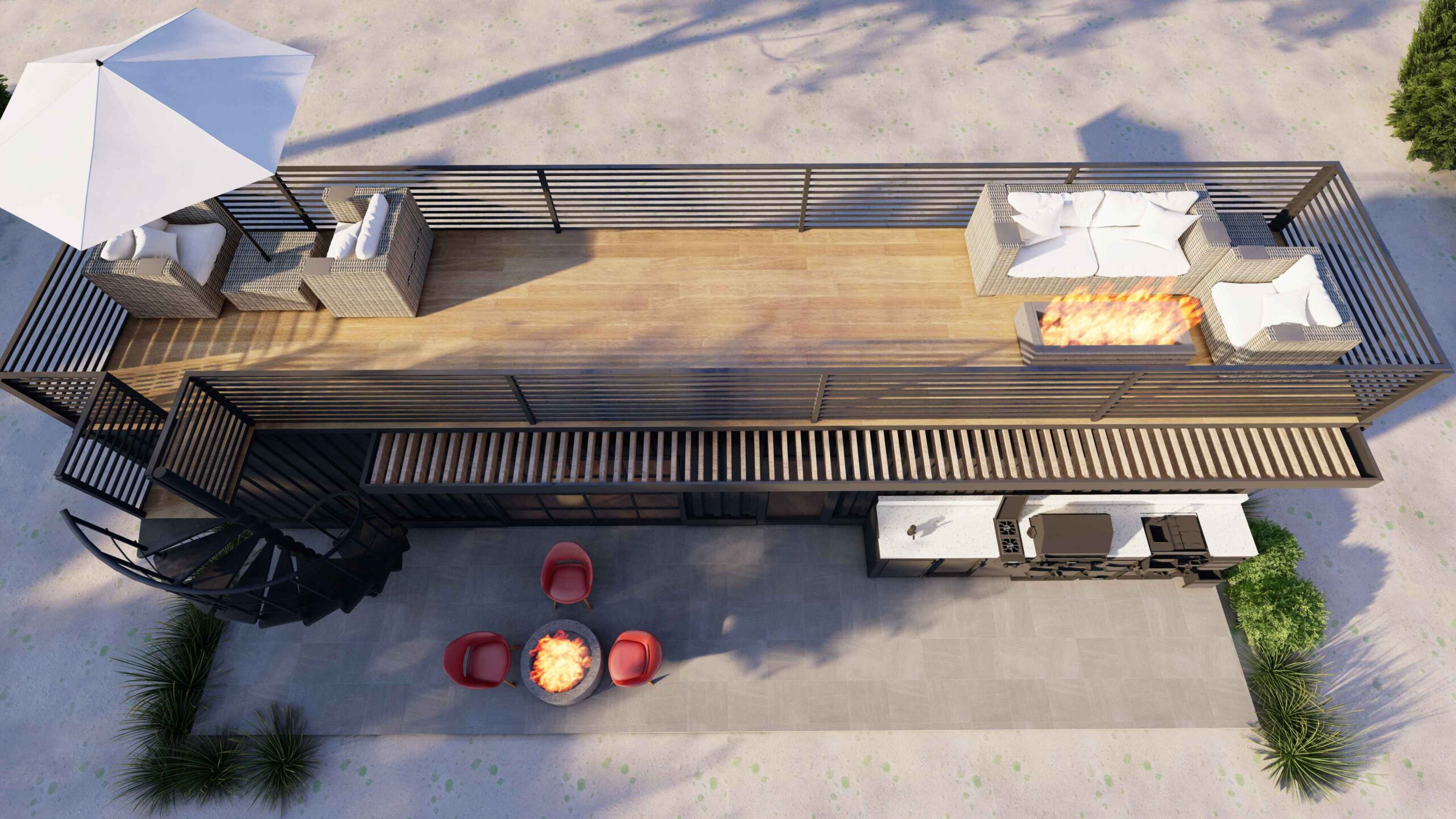 This meticulously crafted two-bedroom container home boasts a spacious 320 square feet of modern living. The intelligently designed open-plan layout features a combined kitchen and living area, fostering a seamless blend of culinary space and comfort. Two cozy bedrooms, each equipped with ample closet space, promise privacy and rest, while the centrally located bathroom ensures convenience. Expansive windows infuse the home with natural light, enhancing the sense of openness. Step outside to a charming patio, perfect for tranquil evenings or your morning coffee. Above, a full-length roof deck becomes your private sky lounge, ideal for entertaining, stargazing, or simply basking in the sun. With additional luxuries like a built-in fireplace, an outdoor B.B.Q, and a stylish fire pit, this container home redefines efficient luxury living.